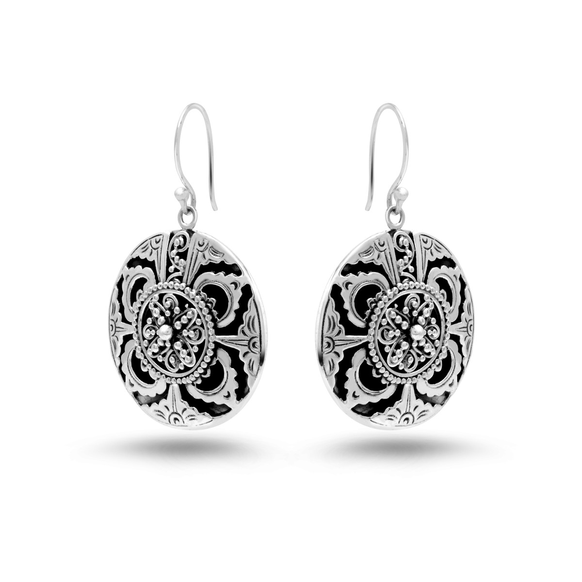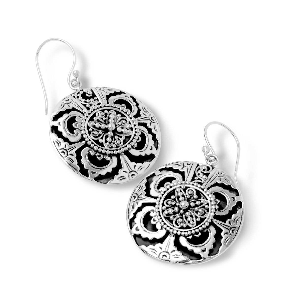 The distinctive four quadrant shield design sets these earrings apart from the ordinary, making them a truly unique accessory to elevate your style. Each quadrant showcases intricate patterns, delicately engraved with meticulous artistry. The interplay of light and shadow brings out the inherent beauty of sterling silver, adding depth and dimension to the design.